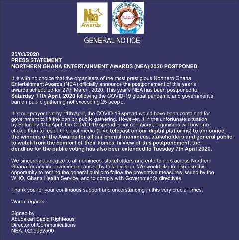 It is with no choice that the organisers of the most prestigious Northern Ghana Entertainment Awards (NEA) officially announce the postponement of this year’s awards scheduled for 27th March, 2020. This year’s NEA has been postponed to *Saturday 11th April, 2020* following the COVID-19 global pandemic and government’s ban on public gathering not exceeding 25 people.
