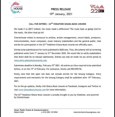 “Charterhouse wishes to announce to artistes, artiste managements, record labels, producers, instrumentalists, music composers, music industry stakeholders and the general public, that entries for participation in the 22 Vodafone Ghana Music Awards are officially open,” the statement said.