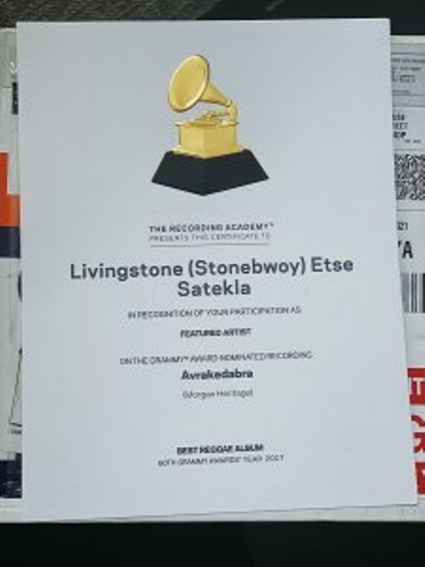 Stonebwoy receives he is Grammy Participation Certificate from Recording Academy.